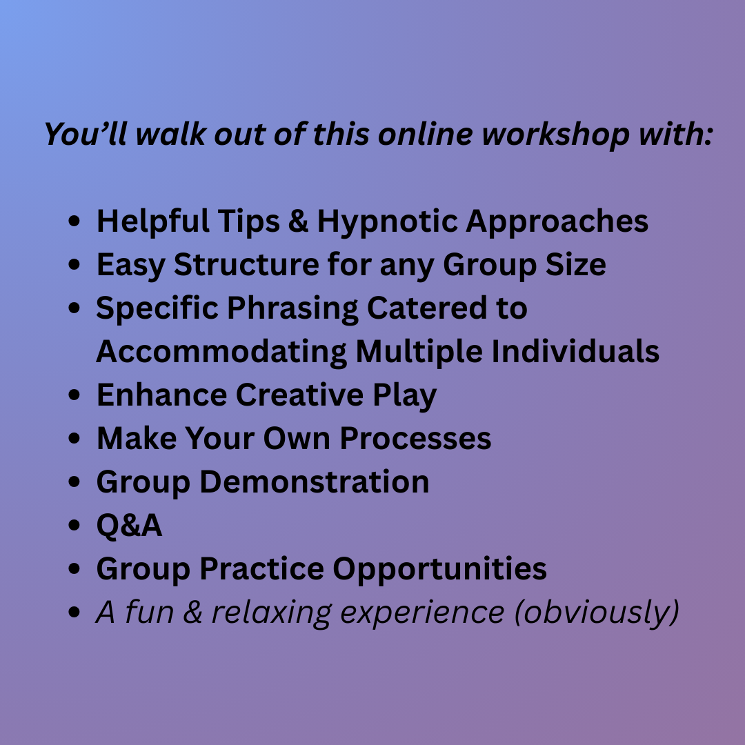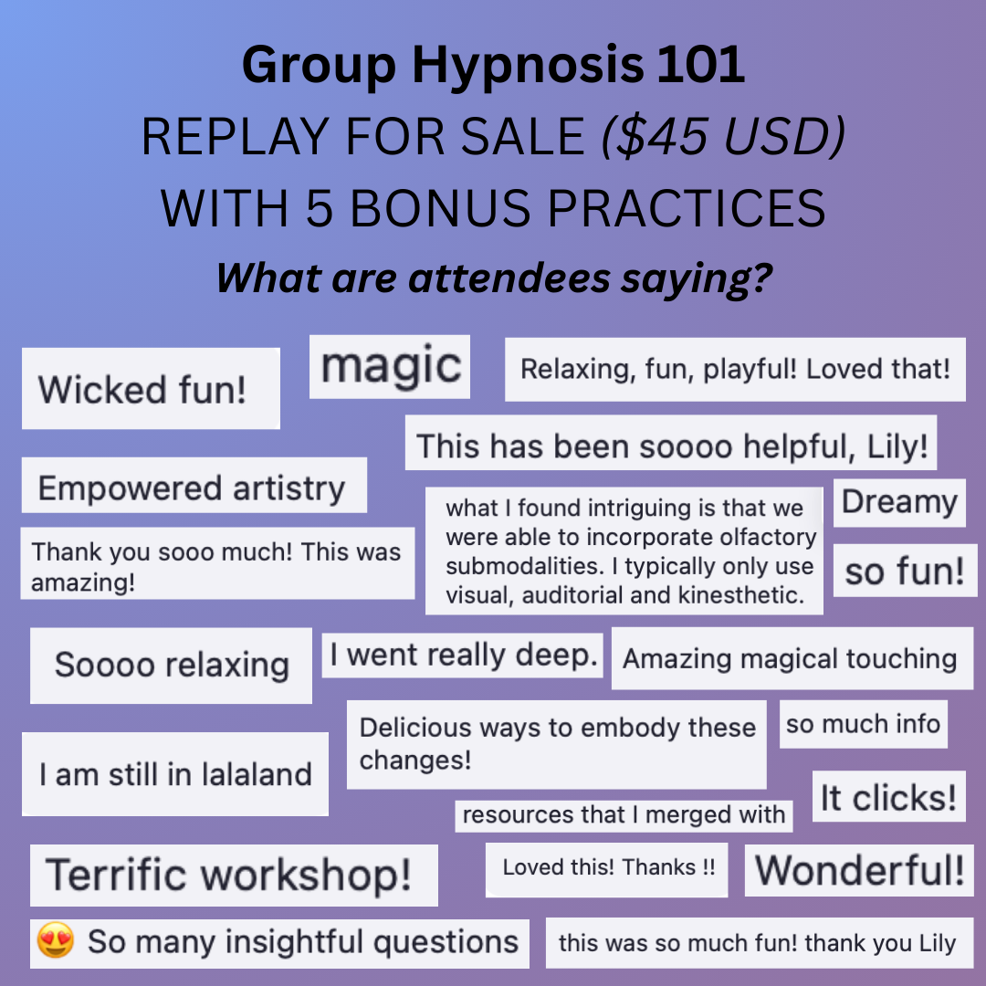 If you are looking to get more comfortable adapting & customizing your offers to group settings, check out the replay for my workshop on ‘Group Hypnosis 101’