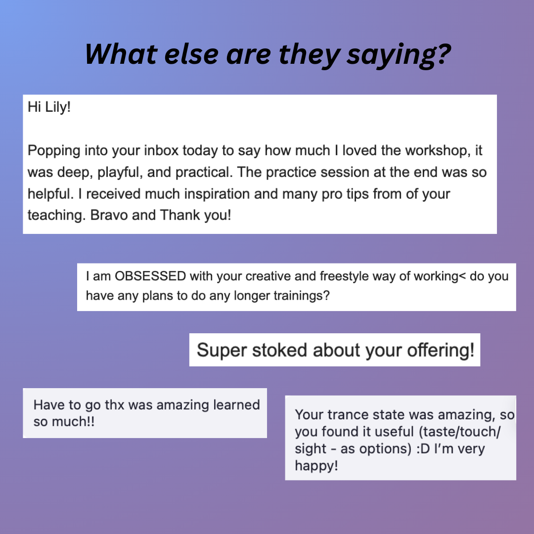 “It worked! I was experiencing imposter syndrome in my business journey and Lily’s workshop changed it for good. I’m so grateful, thank you Lily!” -Jean-Baptiste MacLuckie, Integrative Change Worker